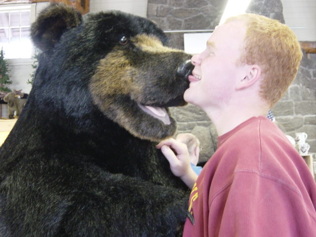 A bear on display in the Old Faithful gift shop and my friend Bill. He didn't stop licking things the whole trip.